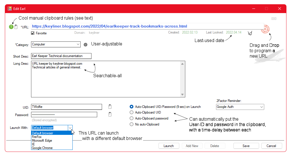 5. Next, EDIT any saved URL that has a UID and password. Press Ctrl-C (Copy) three times. Note how it jumps from one field the the next. This is a an alternate way to get passwords into the clipboard. I'm kind'a proud of this design.