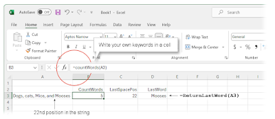 Return to the spreadsheet. Assuming a test-string is in cell A3 ("Dogs, cats, mice, and mooses"), type this formula in cell B3: